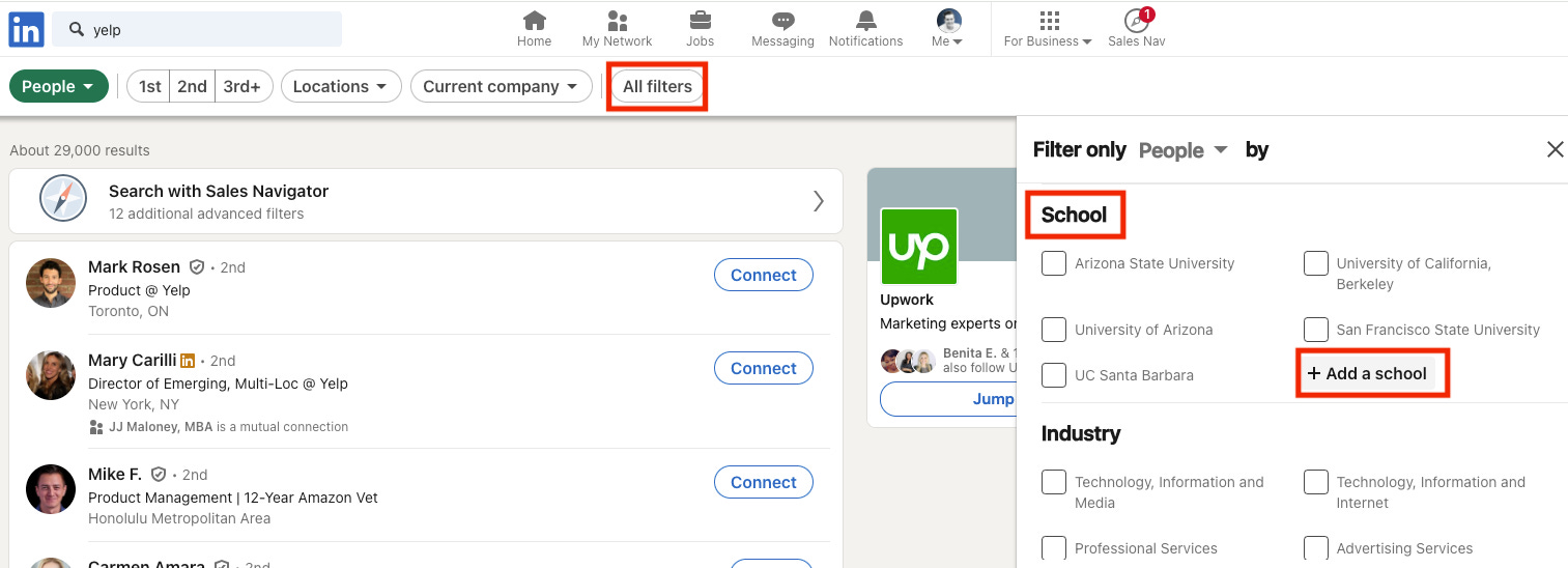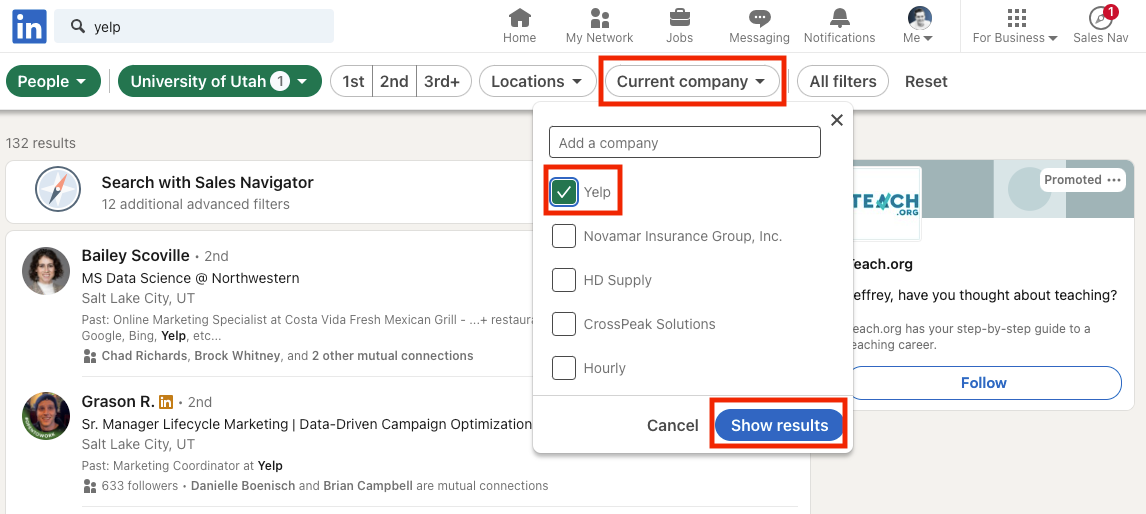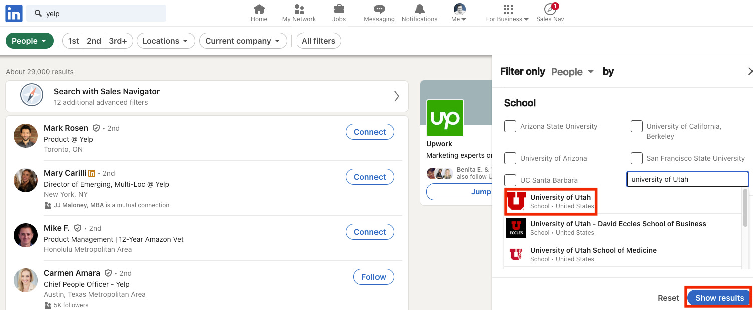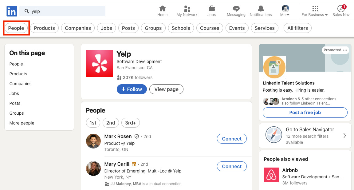 Pro Tip: You want to make sure that you are looking through candidates that still work with the company. LinkedIn may try and show you any person that has “Yelp” in their profile, which could mean they previously worked there, or they simply wrote about it on their profile somewhere.