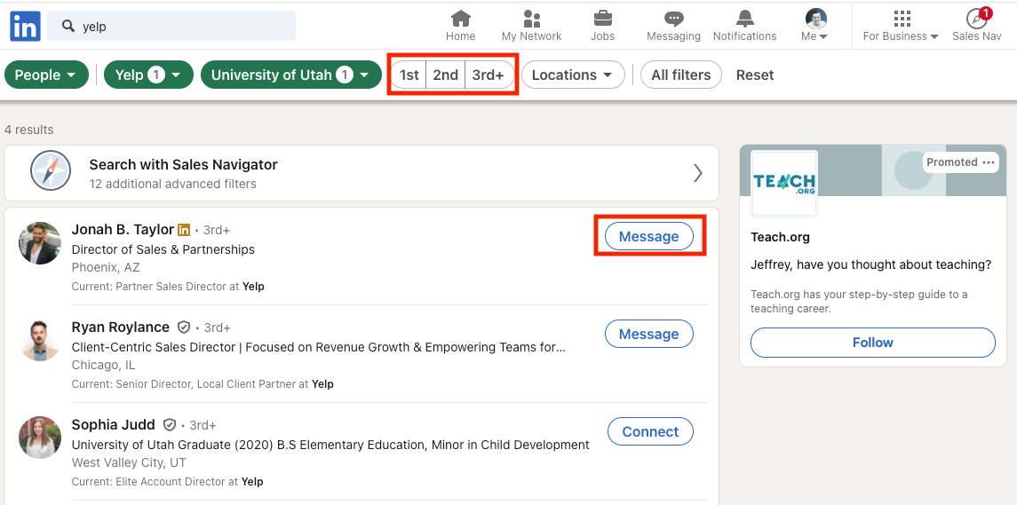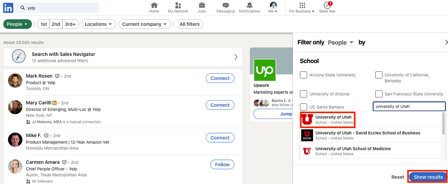 In my example, I had no ‘1st’ or ‘2nd’ connections, so I would lean solely on the fact that we have a shared experience graduating from the University of Utah. When I message the person, I want to make sure I highlight that point.